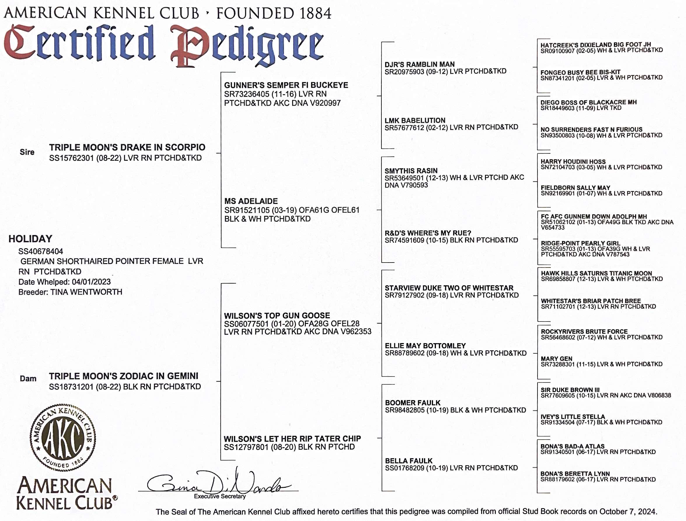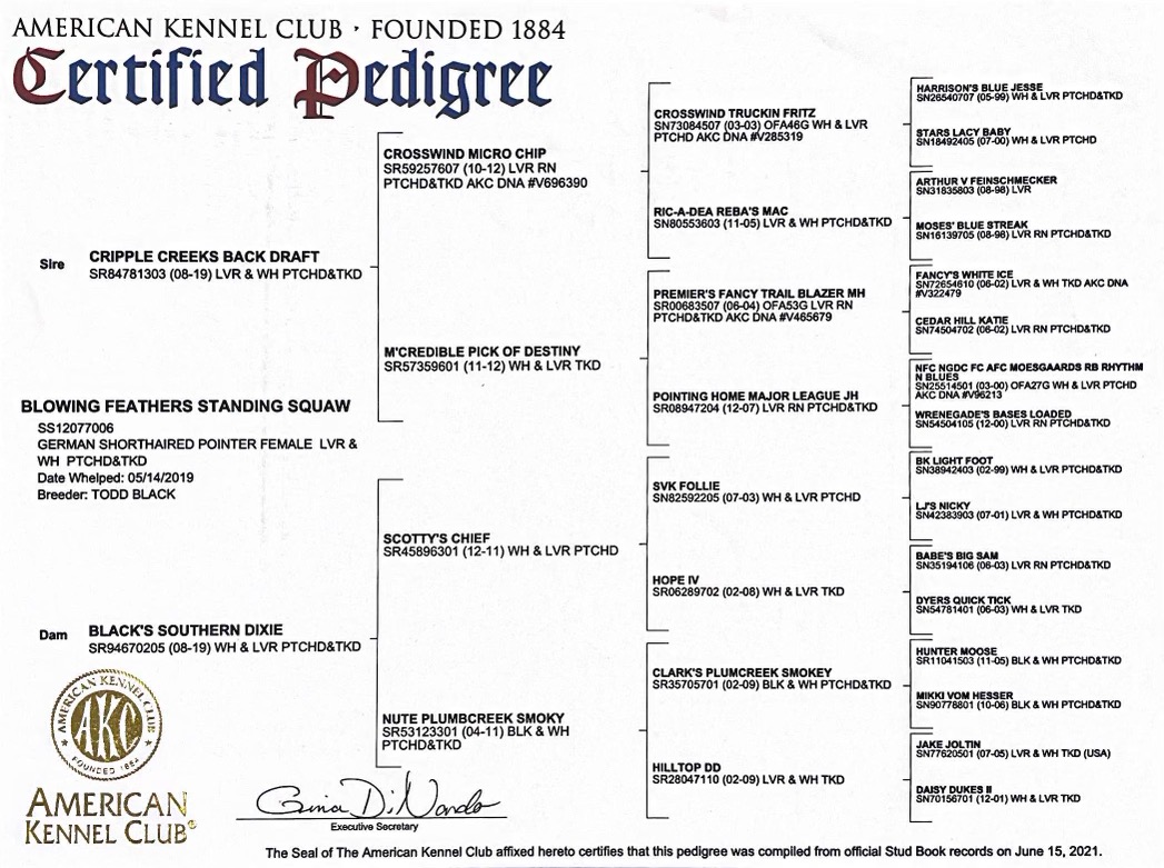 In the field, Skye has all the intensity you want and naturally points, backs, and works the field methodically. She is the fastest moving dog we have. Watching her work is a pretty amazing thing to see. She is a mid to long range hunter in the field and hunts well with others. She is the total package in a German Shorthaired Pointer. She also has an excellent pedigree with NSTRA champions throughout which shows in her working the field.